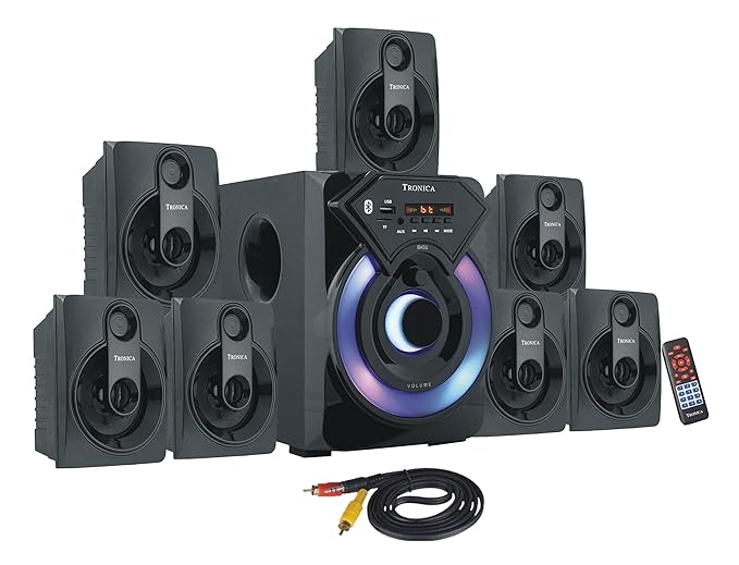 TRONICA Series 7.1 Channel Home Theater System Bluetooth, USB, FM, SD, AUX, RCA Inputs, LED TV Compatible, 4″ Active Subwoofer, 3″ Passive Radiator, Vivid Lighting, Wireless Remote